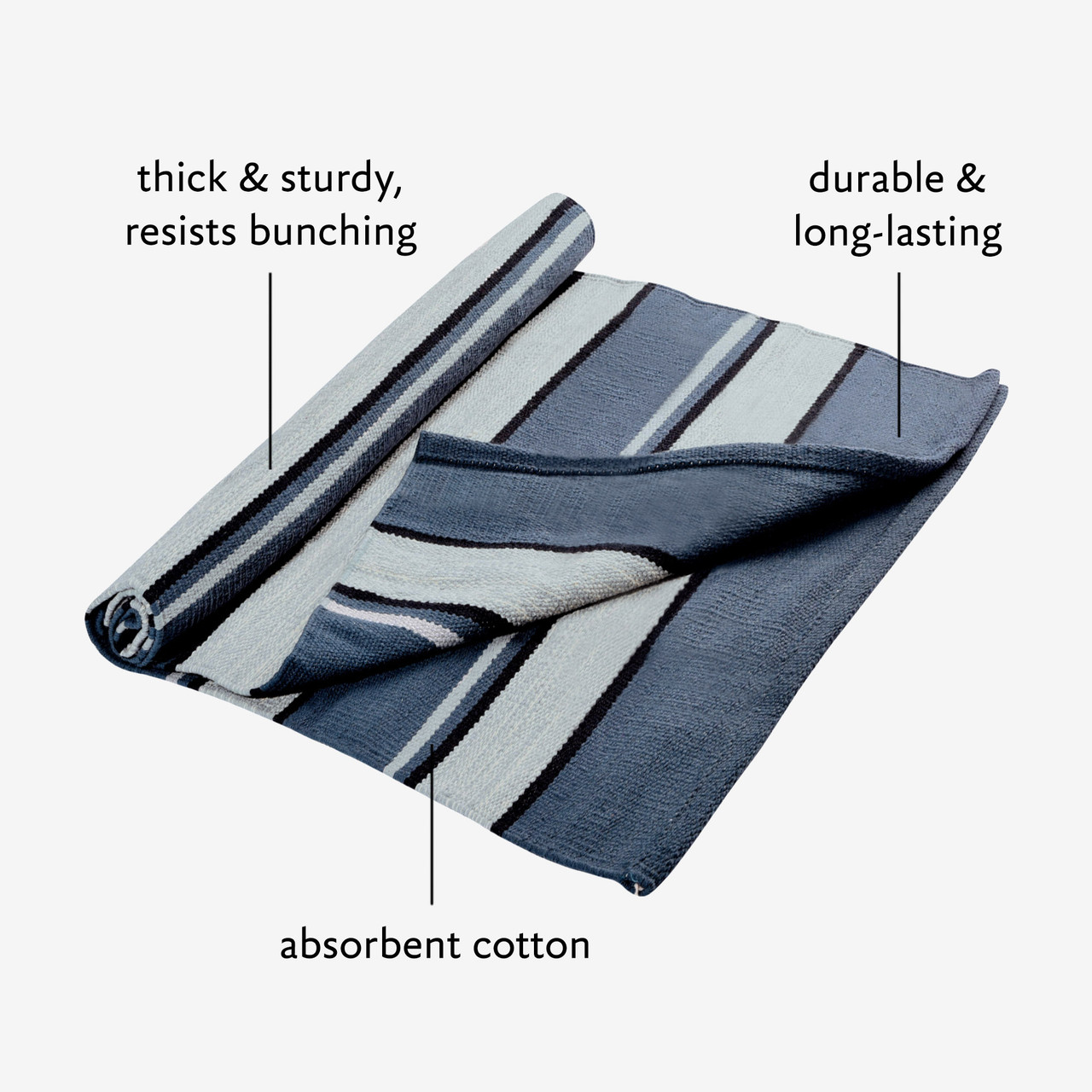This colorful, absorbent cotton yoga rug is traditionally for Ashtanga yoga, but is also a favorite for hot yoga, power yoga, and sweaty hands & feet! Use it flat over your mat, or try it folded as a meditation pad or prop.