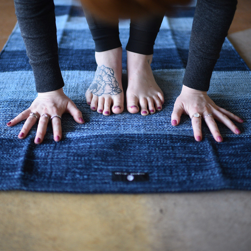 This mat takes a lil bit of getting used to if you have previously only practiced on cushioned mats. My hands will start to slide forward sometimes in Downward Dog, but it is helpful because it reminds me to put my weight into the right parts of my hands! If you usually need cushion for your knees, or in tripod you may want to put a mat or something underneath your rug. I love how these rugs are environmentally friendly as opposed to other mats on the market.
