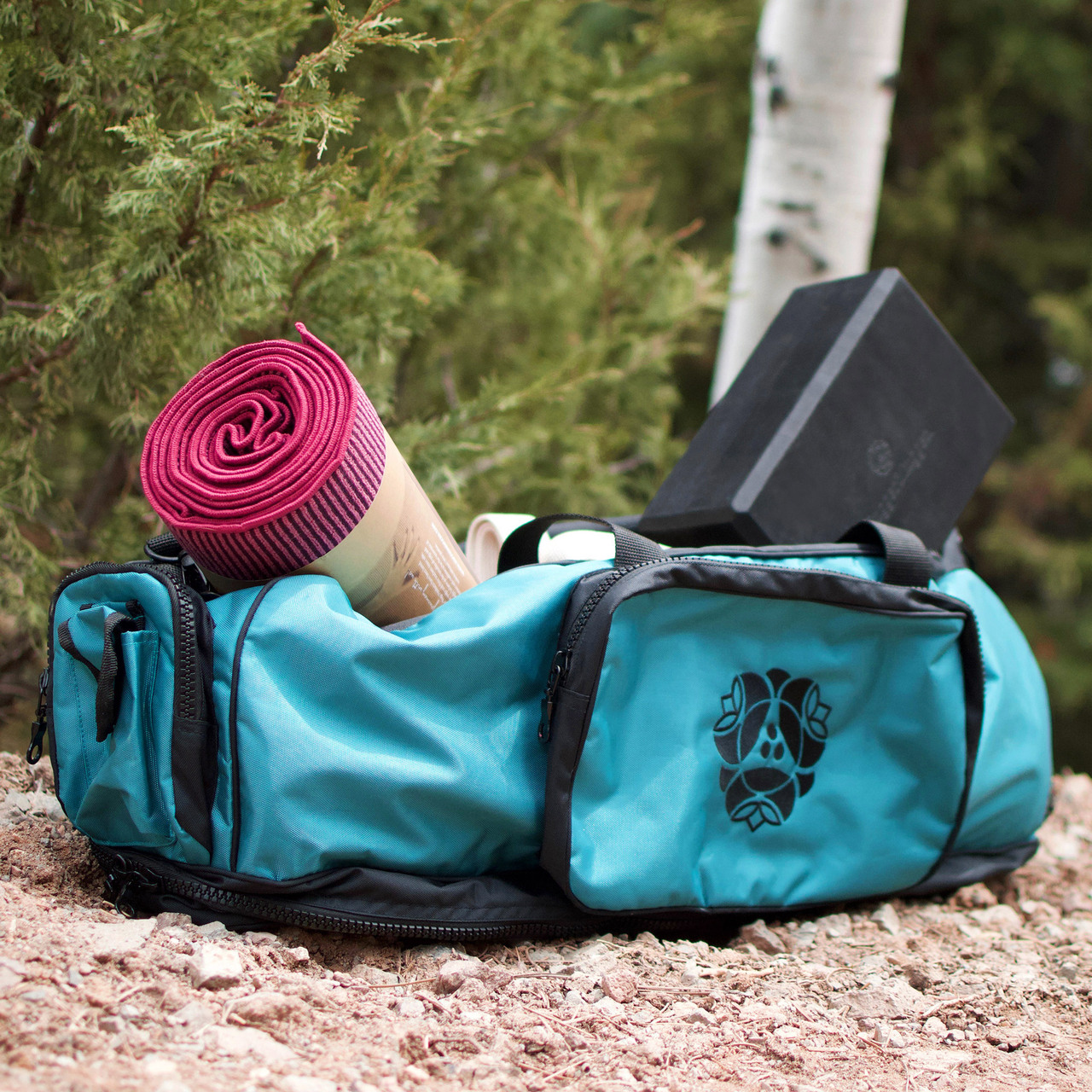 A zippered pocket runs along the bottom of the bag to store your mat (up to 26″ wide, 6.5″ diameter), while the main compartment is large enough to hold blocks, straps, clothing, and more.