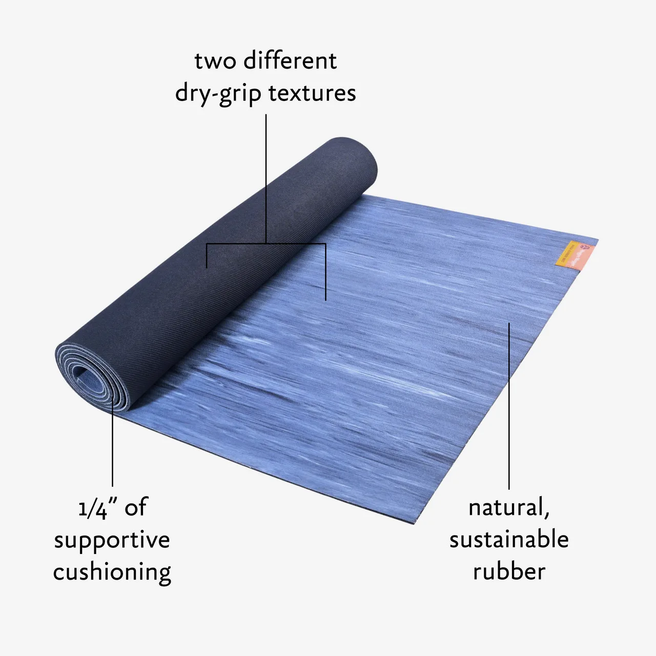 Made with natural rubber, this eco-friendly mat features two different dry-grip textures. The striated side is covered in tiny rubber bumps that hold you perfectly in place, while the solid-colored side has a woven-like, rubbery super-grip that’s great for hot yoga.