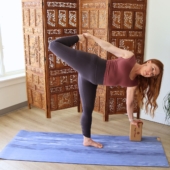 Made with natural rubber, this eco-friendly mat features two different dry-grip textures. The striated side is covered in tiny rubber bumps that hold you perfectly in place, while the solid-colored side has a woven-like, rubbery super-grip that’s great for hot yoga.
